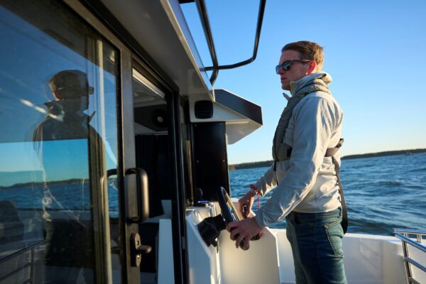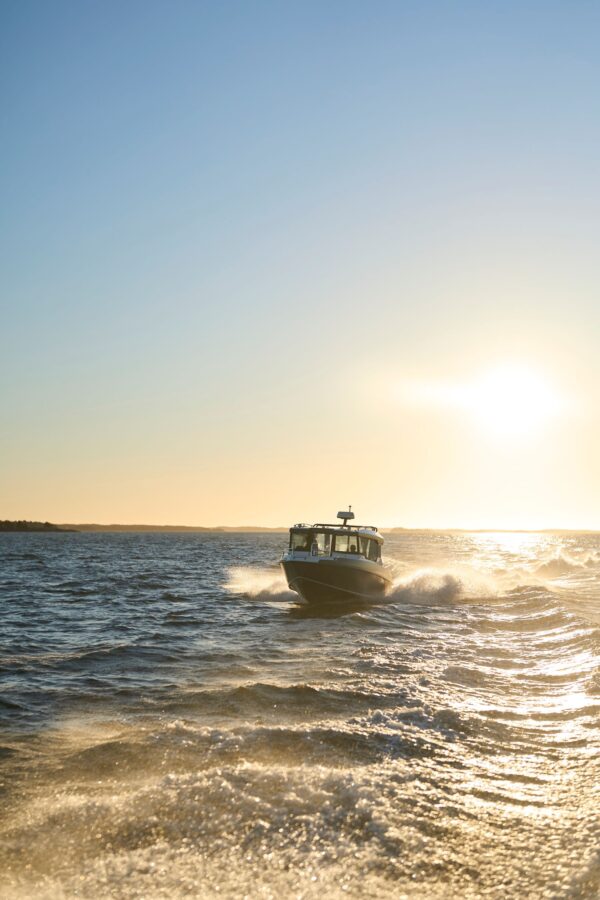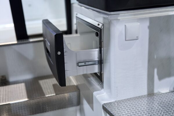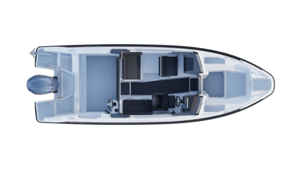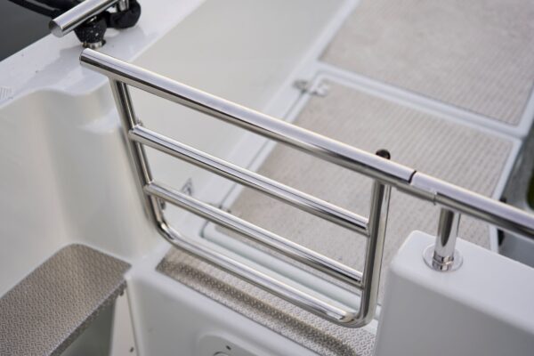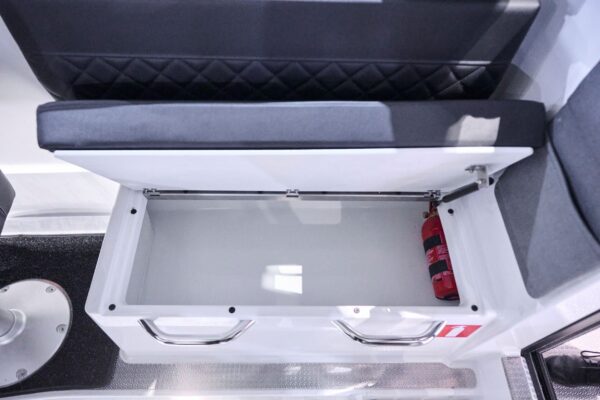 Kabina nabízí výjimečný pocit prostoru díky velkým panoramatickým oknům a 360stupňové viditelnosti, poskytujíc komfort s otevřeným výhledem. Praktická řešení úložného prostoru zahrnují rozsáhlý 350litrový prostor v přídi pro snadné nakládání a střešní zábradlí. Pevná targa tyč v zadní části umožňuje upevnění doplňků.