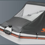 Kromě ochrany posádky udržuje štít vaše věci ve člunu suché a ve stínu, což přispívá k celkově příjemnější plavbě. Také zpevňuje špici člunu, čímž zvyšuje stabilitu a bezpečnost. Pro nerušený výhled je štít v přední části vybaven průhledným oknem, které zajišťuje vynikající viditelnost.