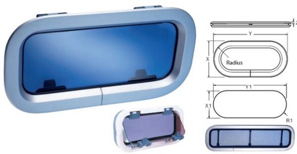 Speciální design vnějšího rámu zajišťuje odtok vody i při úhlové montáži, eliminuje kapání při otevření. Vnější i vnitřní rám jsou z anodizovaného hliníku pro maximální korozní ochranu. Akrylátové sklo má tloušťku 8 mm (10 mm pro velikosti 3 a 5). Všechna okna jsou otevíratelná, s možností kouřového skla na objednávku. Pro stěny o tloušťce 7-34mm.