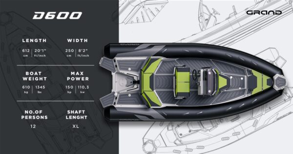 Nafukovací člun GRAND Drive Line D600D je vrcholem přizpůsobivosti a funkčnosti pro komerční i rekreační využití. Tento robustní 6metrový člun s motorem až 150 HP nabízí vynikající stabilitu. Je ideální pro rybolov, potápění, servis, hlídky i komfortní skupinové výlety.