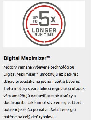 Klíčová inovace spočívá v technologii Digital Maximizer™, která prodloužuje provoz motoru na jedno nabití baterie až pětinásobně. Motor inteligentně čerpá jen nezbytnou energii, minimalizuje plýtvání a zaručuje delší čas na vodě.